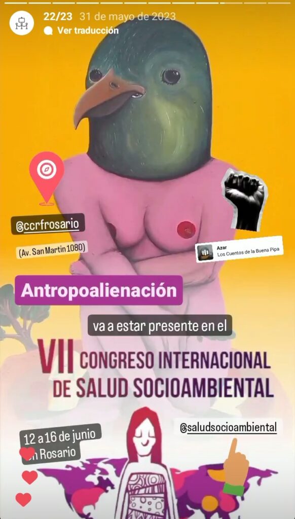 La obra «Antropoalienación» participó del «VII Congreso Internacional de Salud Socioambiental» y «IV Encuentro Intercontinental Madre Tierra Una Sola Salud», organizado por el Instituto de Salud Socioambiental de la Facultad de Ciencias Médicas de la UNR. El mismo se llevó a cabo en Rosario durante los días 14, 15 y 16 de junio de este año.