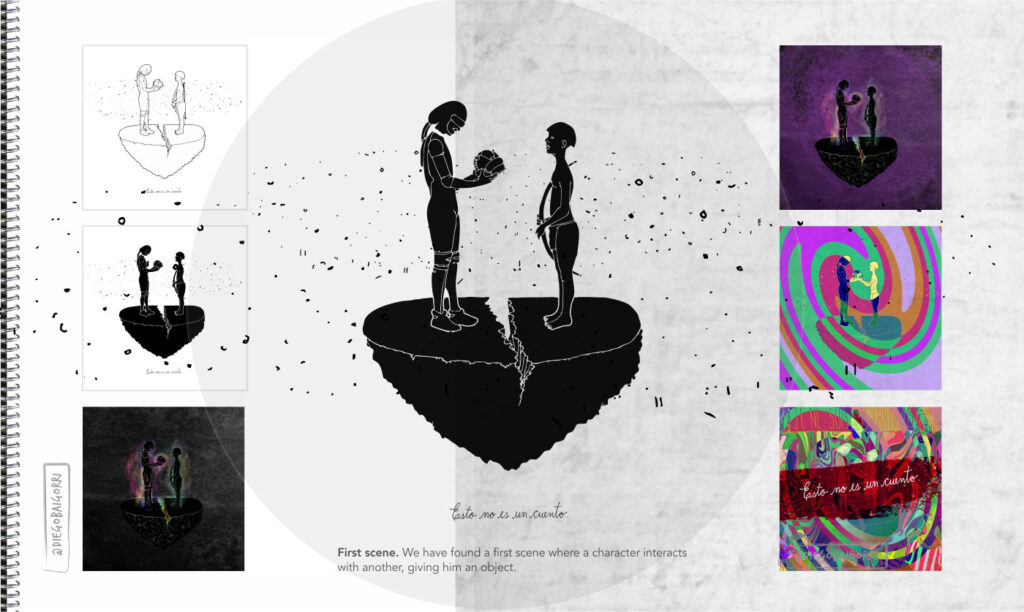 Realicé decenas de bocetos, otras tantas ilustraciones más terminadas, animaciones y pruebas de animaciones, textos y retextos. Entonces, basado en la frase que me acompañó todo el proceso, «esto no es un cuento» (apoyado a su vez en «Esto no es una pipa»: «La traición de las imágenes» de René Magritte y «Esto no es una pipa. Ensayo sobre Magritte» de Michel Foucault), titulé lo producido como «Notttaale».