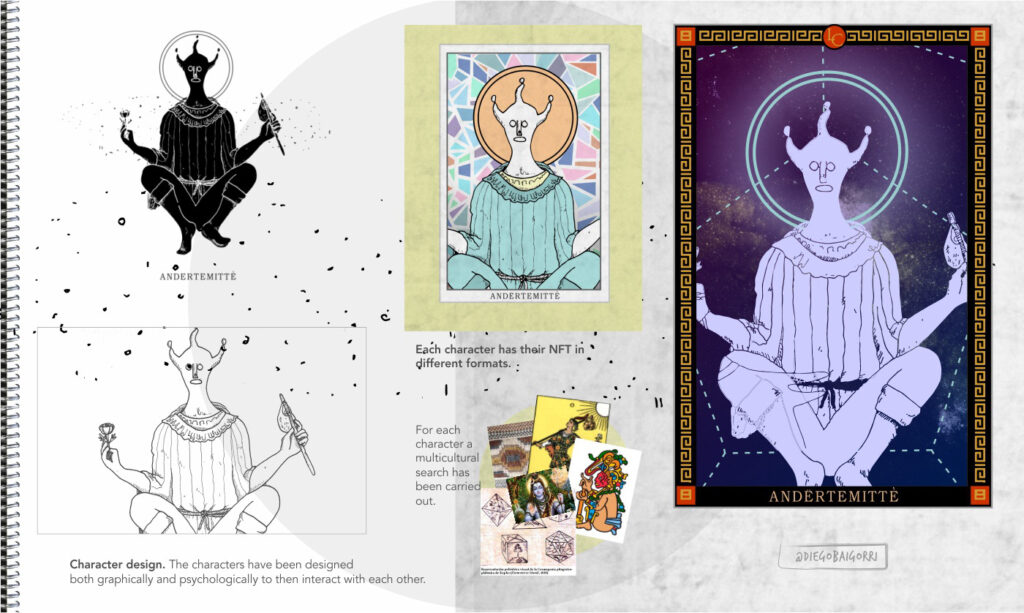 Todos los fondos de las cartas finales (derecha, bordes negros), exceptuando las figuras geométricas, fueron generados por IA.