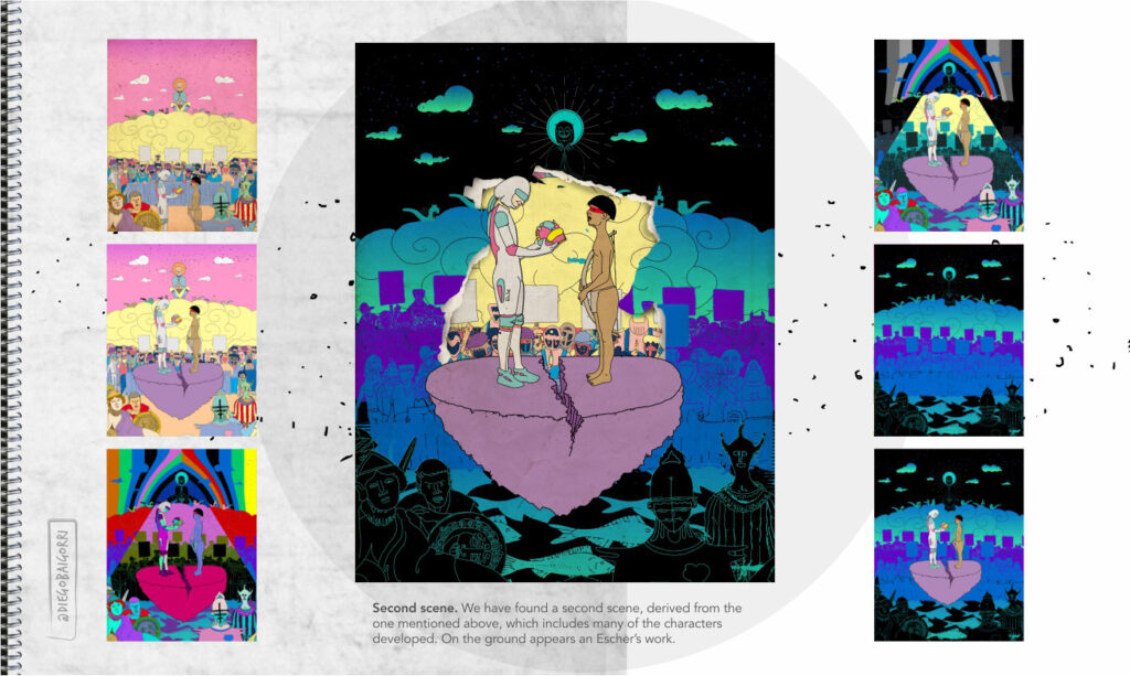 Entre 2022 y 2023 trabajamos con la banda rosarina para descifrar las historias ocultas detrás del material que estaban terminando de dar forma. Comenzamos con unas cuantas charlas, mensajes de WhatsApp y las maquetas que tenían en ese momento. Al escucharlas, como suele sucederme ante estímulos auditivos, conecté inmediatamente con colores, paisajes y escenas. Tras varias idas y vueltas, direccionando ciertos conceptos, nacieron los personajes, la estética y los relatos: unos servían de disparador de otros y otros de unos. Prueba, reprueba, descarte, «vamo’pa’lante».